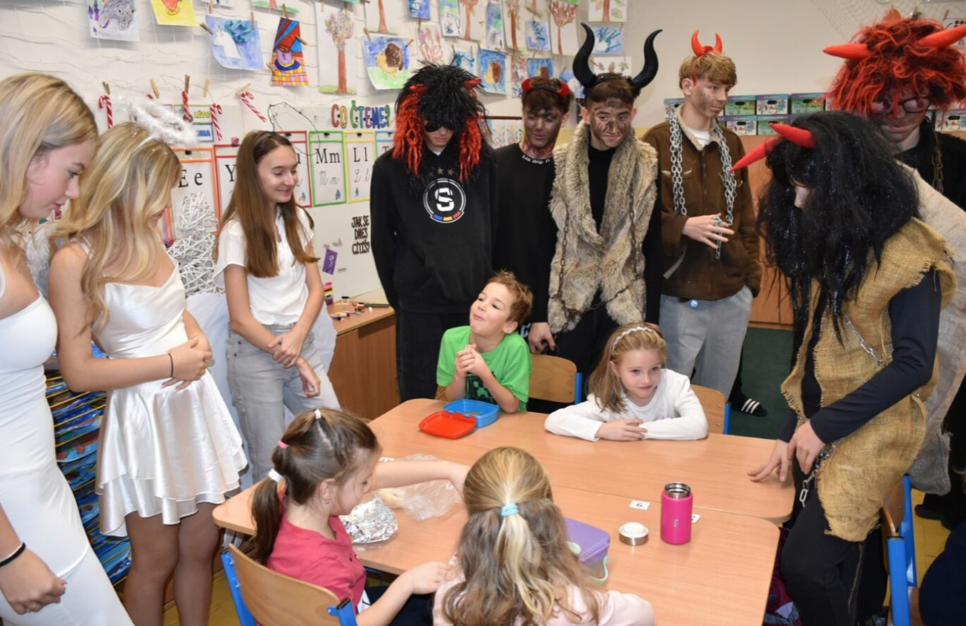 Žáci na prvním stupni opět zažili nevšední návštěvu Mikuláše s anděly a jeho čertovskou cháskou. V každé třídě za básničku či písničku dostaly děti příjemnou odměnu.