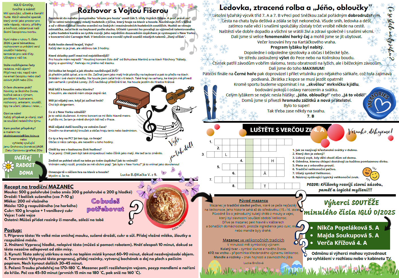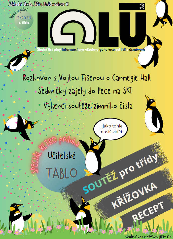 IGLÚ, náš nový čtvrtletník je opět tady a s ním první číslo roku 2026. Redaktorky v terénu, Kačka a Lucka z devítky, si popovídaly s uznávaným hudebním talentem Vojtou Fišerou z 5. B a o jeho cestě za úspěchem. Dozvíte se něco o mazanci a v příspěvku od "Křížky" ze 4. A vyluštíte křížovku. Tento díl má svou speciální přílohu RETRO TABLO vyučujících se soutěží pro celé třídy.